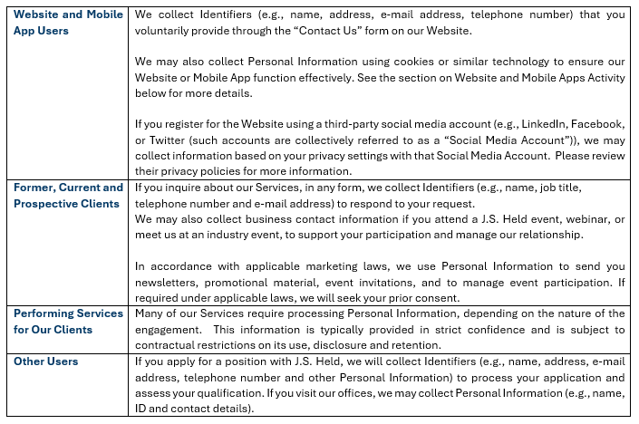 También procesamos Información personal que hemos recopilado, o que nos ha llegado a través de nuestro Sitio web, otras Comunicaciones y Aplicaciones y Servicios móviles que se relacionan con este Aviso de privacidad o lo publican, así como de potenciales clientes a los que apuntamos, solicitantes de contratación, participantes de conferencias de J.S. Held y personas relacionadas. Este Aviso de Privacidad no aplica a la recopilación, el uso y la divulgación que nosotros hagamos de Información Personal sobre empleados actuales o anteriores.