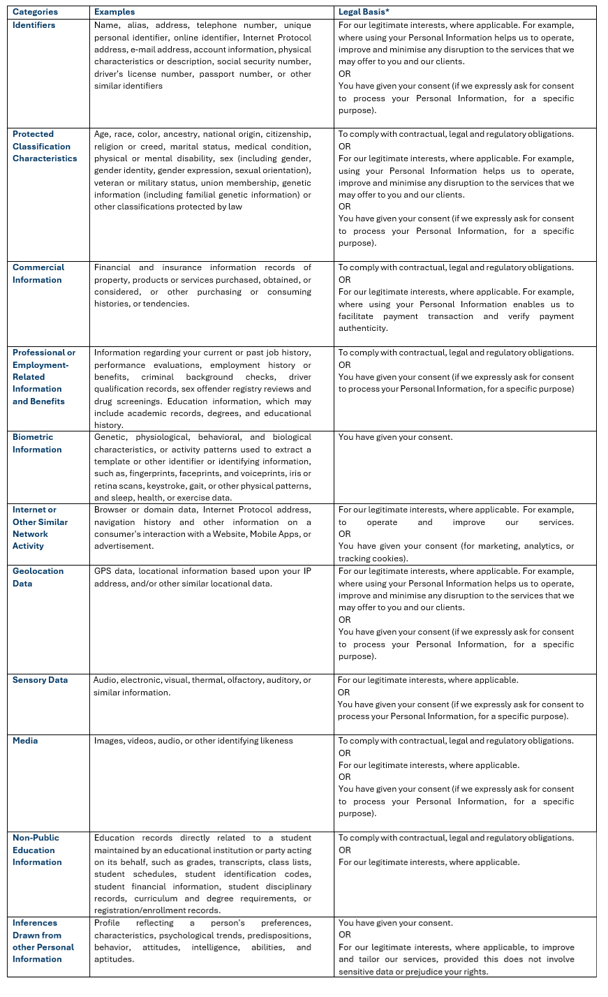 *The legal basis for processing may vary depending on your location and applicable law. Where more than one basis applies, we will rely on the most appropriate basis for each processing activity.