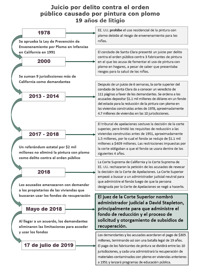 LEER MÁSTras casi 20 años de litigio contencioso relacionado con el uso de pintura con plomo en viviendas, David Stapleton fue designado interventor judicial del fondo de USD 409 millones para la reducción de pintura con plomo otorgado a los demandantes por el Tribunal de Apelaciones en el caso The People of the State of California v. ConAgra Grocery Products Company, et al. ("Fondo de reducción"). El nombramiento se produjo luego de un proceso competitivo de seis meses entre diez interventores calificados. Aproximadamente un año después, demandantes y demandados resolvieron el caso mediante un acuerdo por USD 305 millones.