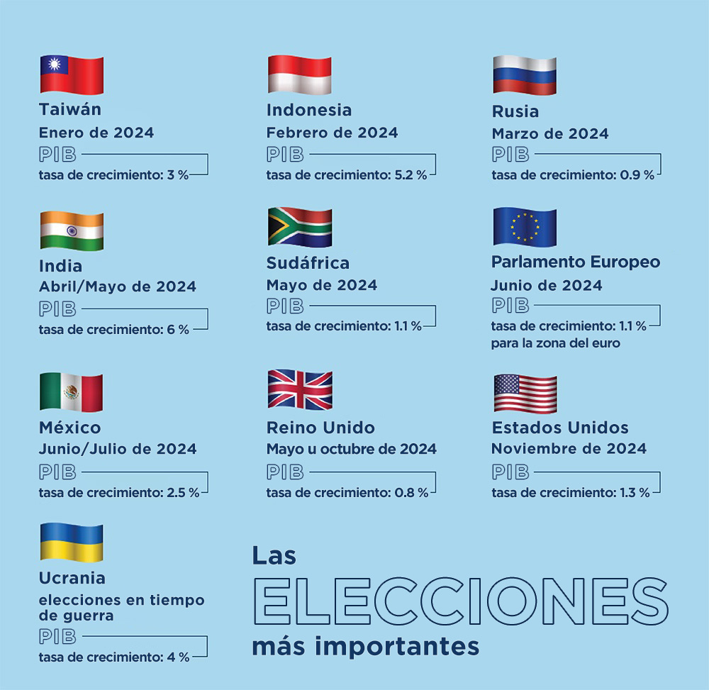 En 2024 se celebrarán un número extraordinariamente elevado de elecciones nacionales en muchos países del mundo, incluso en algunas de las mayores economías: Estados Unidos, Reino Unido, India, México, Sudáfrica, Indonesia, Rusia... e incluso en el Parlamento Europeo. Más de cuatro mil millones de personas de al menos 60 países concurrirán a las urnas para elegir quién los gobernará y dará forma a la política económica y social. En muchos casos, estas elecciones se celebran por primera vez desde la pandemia de COVID-19 y los grandes conflictos militares: primero, la invasión rusa a gran escala de Ucrania y, más recientemente, la guerra entre Hamás e Israel.