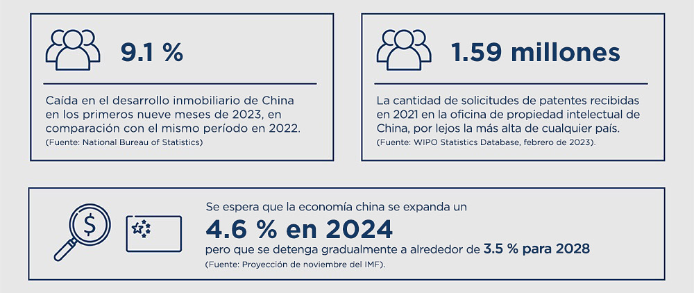 Después de 30 años de crecimiento extraordinario, la economía de China, la segunda más grande del mundo, parece estar entrando en una nueva fase de expansión más lenta. El sector inmobiliario, que representa alrededor de un tercio del PIB chino y ha sido uno de los principales motores de la economía del país, está en crisis. Las exportaciones y la inversión extranjera se han estancado, el desempleo juvenil está en niveles récord y la recuperación pospandemia ha sido débil. Mientras tanto, existen problemas estructurales a largo plazo: la población está envejeciendo, la cohorte de personas en edad de trabajar está disminuyendo y la economía sigue desequilibrada, en parte debido a que los consumidores optan por ahorrar, lo que resulta en una demanda más débil de productos y servicios. Los niveles futuros de inversión extranjera también están en discusión: entre julio y septiembre de 2023, China registró su primer déficit en inversión extranjera, posiblemente un indicador de que la "reducción de riesgos" de los gobiernos occidentales está empezando a tener un impacto.