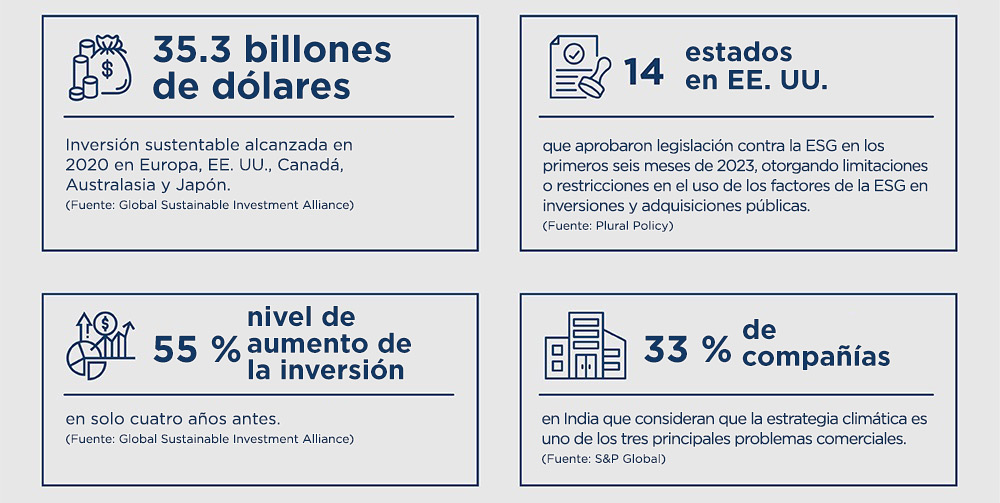 En la Encuesta de Percepción de Riesgos Globales 2019-2020 del Foro Económico Mundial realizada entre sus miembros, el FEM concluyó que las cuestiones ambientales representaban cinco de los 10 principales riesgos económicos tanto en términos de probabilidad como de impacto durante la próxima década. A pesar de la oposición en materia de ESG en ciertas áreas, los inversores, accionistas, consumidores e, incluso, los empleados reconocen cada vez más el valor de las empresas comprometidas con la sostenibilidad y los objetivos relacionados. Las empresas que comienzan en forma temprana a utilizar los datos e informes sobre ESG se asegurarán de contar con los procesos adecuados de gestión de riesgos y gobernanza y pueden esperar obtener una ventaja competitiva.