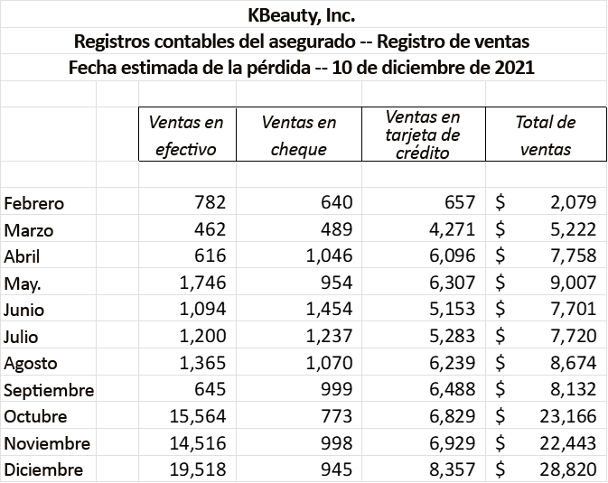 KBeauty, Inc., un salón de belleza de uñas de alta gama, presentó un reclamo por pérdidas provocadas por empleados a la Compañía de Seguros XYZ en el que se alegaba que USD 10,000 fueron sustraídos del negocio cerca del 10 de diciembre de 2021. El asegurado afirma que el dinero en efectivo proviene de las ventas acumuladas de los meses anteriores.