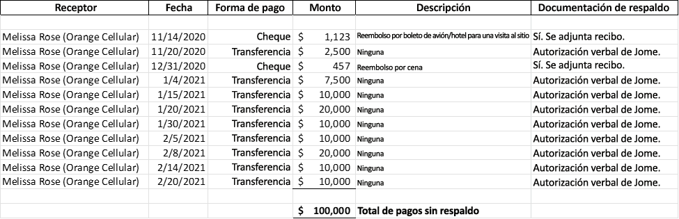 En función de los datos disponibles, se hicieron 11 pagos a Melissa Rose en 2020 y 2021 tanto por cheque como por transferencia bancaria. Se hicieron dos pagos para el reembolso de los gastos de viaje en avión, hotel y cena con motivo de una visita a la sede social de MManufacturing. Se obtuvieron los recibos y la documentación de los archivos que justifican estos reembolsos. Se hicieron nueve transferencias a Melissa Rose por un total de USD 100,000. No había ningún comprobante de estos pagos.