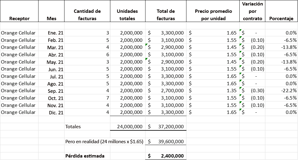 Luego, el contador forense analizó los pliegos de condiciones pertinentes, junto con las facturas y los pagos efectuados a Orange Cellular. El siguiente cuadro muestra el total de unidades vendidas por mes (dos millones por mes y 24 millones en total), el importe total de las facturas y el precio promedio por unidad vendida. La tabla también muestra claramente que, en algunos meses, el precio promedio por unidad es inferior al precio contractual de USD 1.65 por unidad.