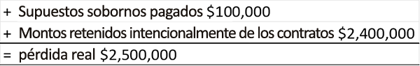 El primer paso para medir un siniestro por pérdidas provocadas por empleados en el marco de soborno y corrupción es la determinación de los cálculos que deben hacerse. Por lo general, la pérdida potencial se evalúa mediante el análisis del impacto financiero para la compañía. Por ejemplo, si un empleado pagó un soborno, ¿cómo se pagó el soborno? ¿Se pagó en efectivo, en servicios o mediante la transferencia de inventario? La determinación del método de pago definirá gran parte del análisis que se necesita.