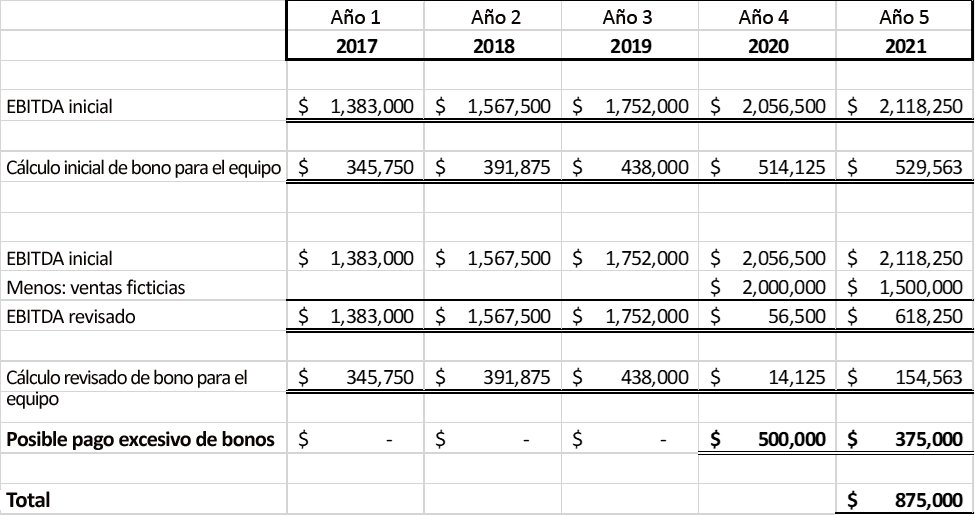 Por lo tanto, para determinar las pérdidas ocasionadas por los empleados (es decir, el valor del posible reclamo), el contador forense debe calcular primero la reserva para bonos de los ejecutivos antes de ajustar las entradas anteriores de la siguiente manera: