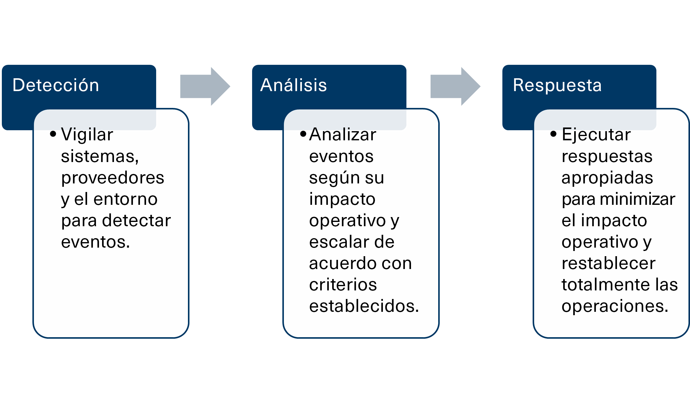 La mayoría de los planes de respuesta ante incidentes incluyen tres componentes principales, que siguen la secuencia de la forma en que una organización reaccionará ante los eventos. Estos incluyen detectar eventos, analizar eventos y responder a eventos.