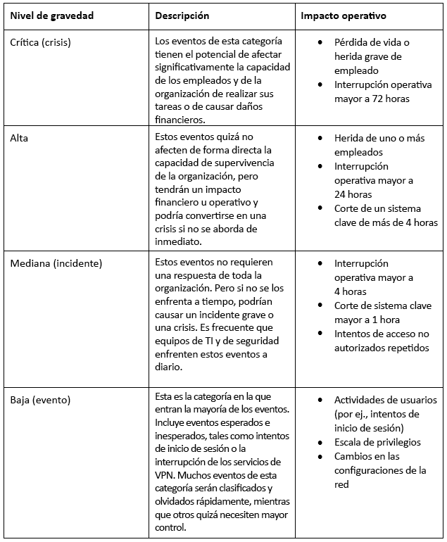 A menudo, los planes de respuesta ante incidentes definen diversos criterios y, luego, proporcionan un cuadro de eventos de ejemplo para ayudar al personal a comprender mejor cómo clasificar los eventos (ver figura 1). En algunos casos, es posible que las organizaciones creen cuadros separados para impactos en los empleados, operativos y financieros. Los criterios deben revisarse y actualizarse de manera periódica para garantizar que estén alineados con el negocio.