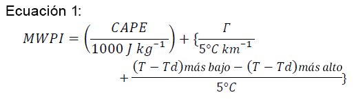 En la Ecuación 1, el símbolo 훤훤 representa la tasa de lapso de temperatura entre los niveles de presión superior e inferior seleccionados. Esta tasa se basa principalmente en la capa de mezcla convectiva subnubosa del entorno de la tormenta principal. Tradicionalmente, el MWPI selecciona por defecto la capa entre los niveles de 850 y 670 mb, según los estudios de Ellrod (1989) y Maddox et al., (1995; Pryor, 2015). Sin embargo, en regiones de mayor elevación, se consideró la capa de 500 a 700 mb (Pryor y Miller, 2016; Pryor, 2017; basado en Caplan et al., 1990). Por otro lado, en entornos marítimos y durante el día, se evaluaron incluso niveles de mezcla convectiva cercanos a la superficie o basados directamente en la superficie (por ejemplo, Pryor, 2016).