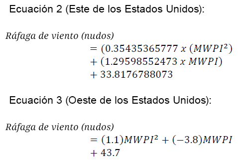 El MWPI sin unidades se aplica entonces a la Ecuación 2 o a la Ecuación 3 (en función de la geografía) para obtener una magnitud de ráfaga de viento:
