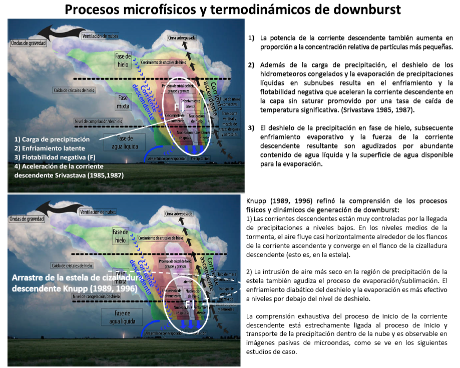 La Figura 1 resume los factores termodinámicos y dinámicos favorables que promueven la generación de fuertes vientos de salida: 1) carga de precipitación, 2) enfriamiento latente, 3) flotabilidad negativa (Fdown), 4) aceleración de la corriente descendente, 5) arrastre de la estela de cizalladura descendente y 6) circulación por el flanco posterior/chorro de flujo posterior.