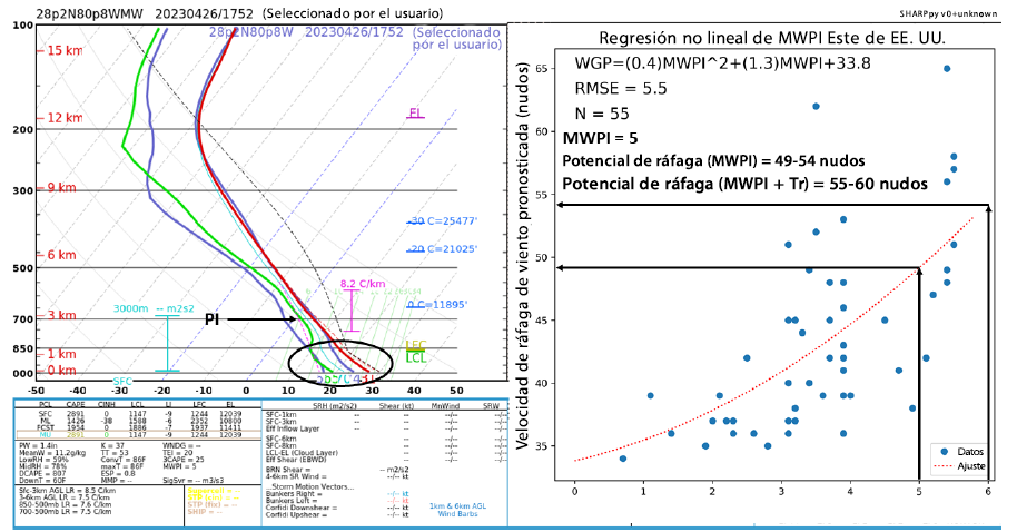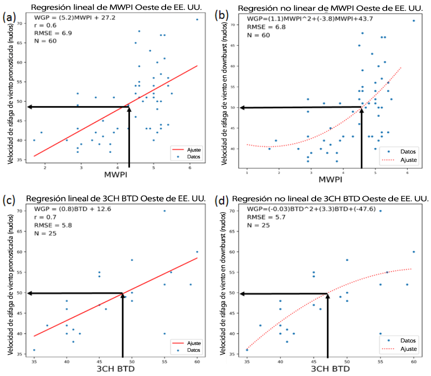 Como se demuestra en la Figura 2, los gráficos de regresión del potencial de ráfagas de viento del MWPI y las ecuaciones de regresión asociadas se derivan mediante una comparación directa entre los valores calculados del MWPI y las velocidades de ráfagas de viento medidas en downbursts cercanos.