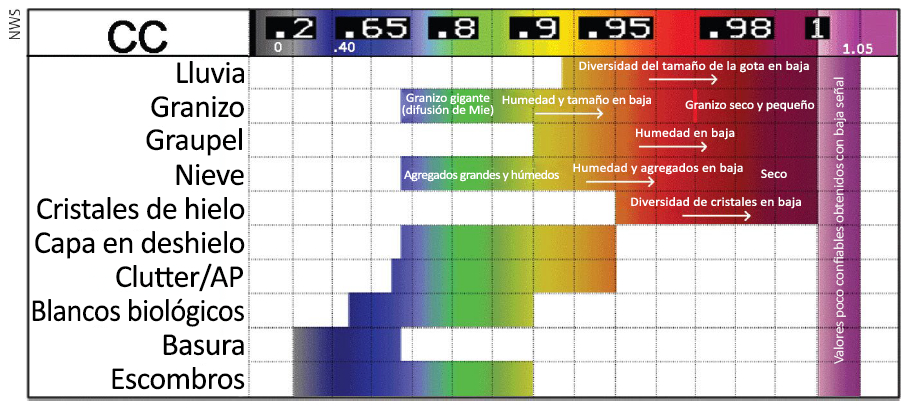 Figura 4: Representación gráfica de la relación entre los valores medidos del coeficiente de correlación del NEXRAD de EE. UU. y la fase/tipo de precipitación.