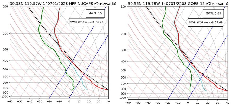 Figura 5: Comparación del perfil de sondeo del NUCAPS de la NPP (izquierda) y los GOES (derecha) del 1 de julio de 2014 en el noroeste de Nevada.