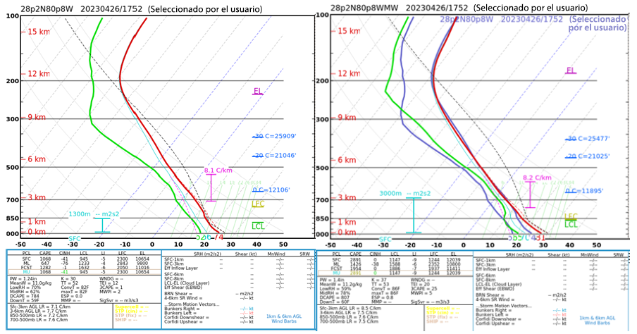 Figura 8: Comparación de recuperación física (infrarrojo+microondas, izquierda) y de microondas (microondas, derecha) del NUCAPS de la NOAA-20 a las 1752 UTC del 26 de abril de 2023 cerca de Melbourne, Florida.