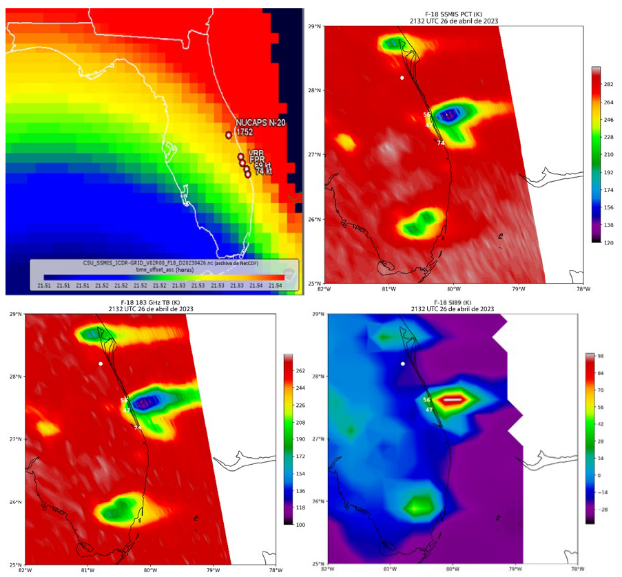 Se registraron ráfagas de viento de downburst adicionales en los aeropuertos de Vero Beach (56 nudos a las 2042 UTC) y Fort Pierce (47 nudos a las 2103 UTC); y la más fuerte del evento se registró en la estación meteorológica Weatherflow de Jensen Beach (74 nudos a las 2146 UTC). El sobrevuelo del sensor de microondas especial/generador de imágenes (SSMIS) de la Plataforma de Satélites Meteorológicos de Defensa (DMSP) F-18 del final de la tarde (2132 UTC), como se observa en la Figura 9, fue óptimo para observar las características físicas de la tormenta de supercelda que favorecieron la generación de downburst. La imagen del NEXRAD de Melbourne en la Figura 10 mostró la ocurrencia coincidente de alta reflectividad y valores relativamente bajos del coeficiente de correlación (0.8-0.9) dentro del núcleo de precipitación de la tormenta, lo que indicó la presencia de una gran cantidad de graupel y granizo. Una alta concentración de precipitación en fase de hielo en el flanco posterior de la tormenta favoreció la generación de un intenso downburst que fue promovido por una gran cantidad de enfriamiento latente y la flotabilidad negativa resultante de acuerdo con el proceso descrito en la Figura 1.