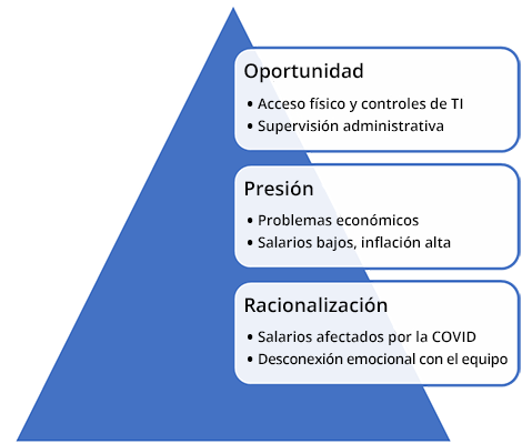 Si bien el robo de datos y la ciberdelincuencia son casos de ataques externos, la mayor amenaza para las organizaciones proviene de los empleados no supervisados. Veamos ahora el aumento del riesgo de fraude debido al cambio en el entorno de trabajo a través de la lente del triángulo del fraude que "sostiene que las personas tienen la motivación de cometer un fraude cuando se dan tres elementos: 1) cierto tipo de presión percibida, 2) alguna oportunidad percibida o 3) alguna forma de racionalizar el fraude como algo que no es incompatible con los propios valores".[3]