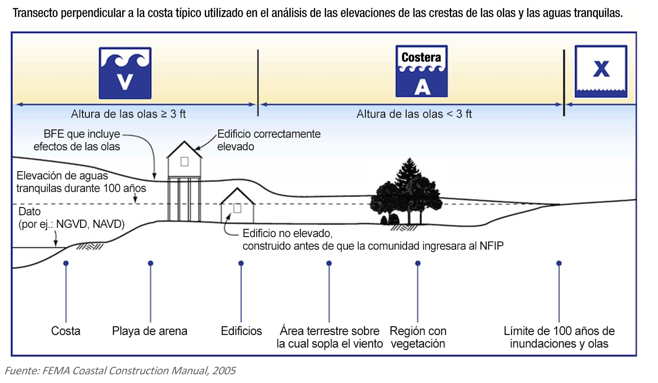 Los edificios dentro de la zona de evacuación también pueden estar dentro de la Zona de inundación V o la zona de velocidad. La Zona V se caracteriza por tener olas de más de 3 pies de altura. Esta altura de ola es común tanto para la marejada ciclónica en la zona de inundación V como en la zona de evacuación, lo que hace que sea fácil de recordar (consulte la figura 1, arriba).