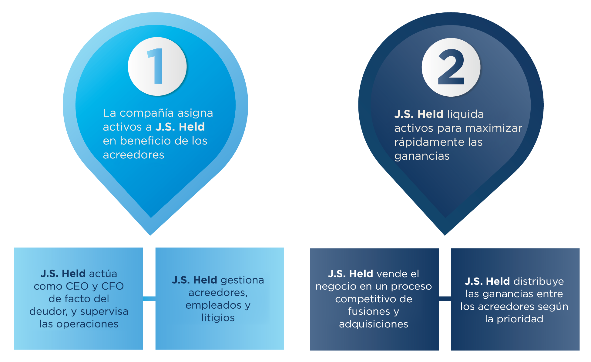 Nuestro equipo actúa como el CEO y CFO de facto de la empresa en dificultades, tomando el control de las operaciones; gestionando acreedores, empleados y litigios; preparando y ejecutando la venta de activos empresariales; y distribuyendo los ingresos a los acreedores según su prioridad.